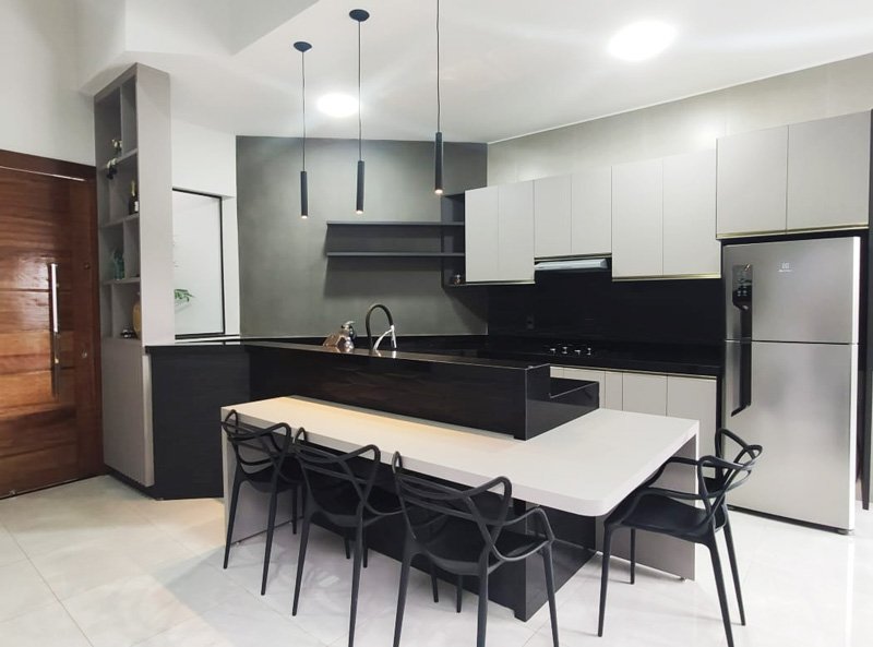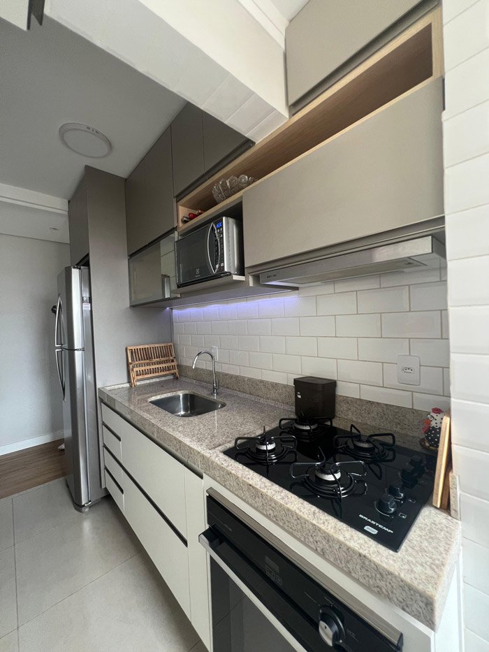 - Cozinhas planejadas com armários superiores e inferiores sob medida;