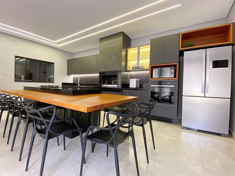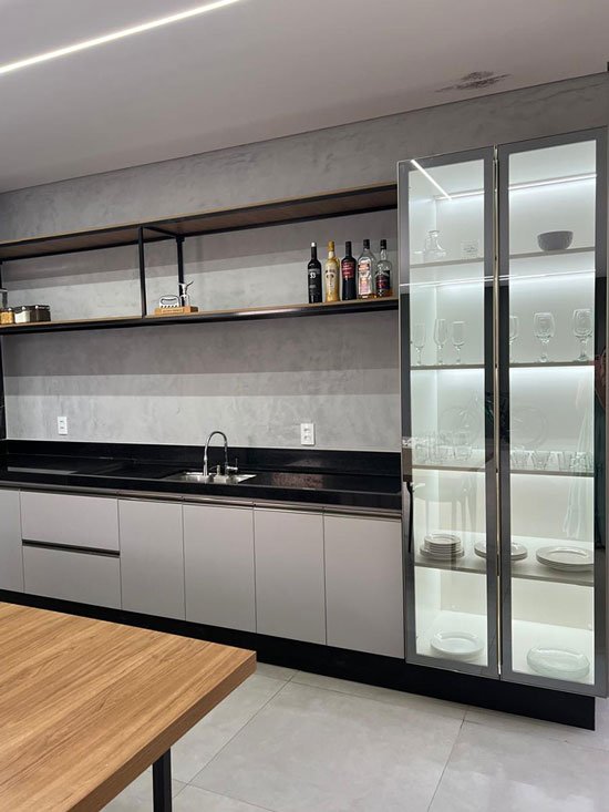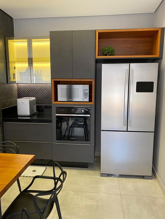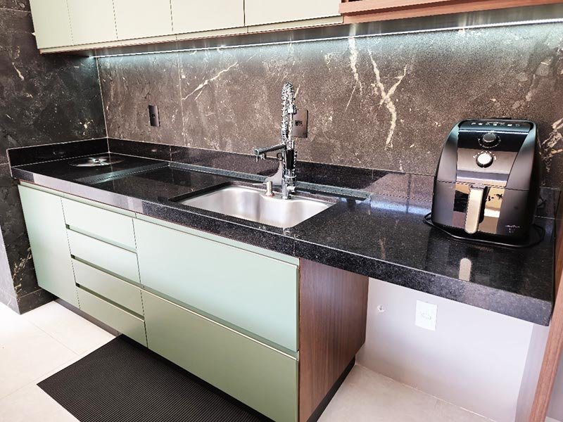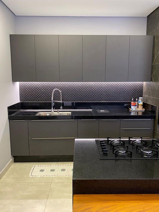 - Cozinhas planejadas com armários superiores e inferiores sob medida;
