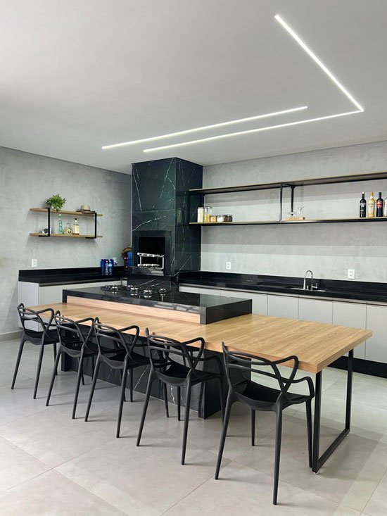 - Espaços integrados à sala de estar ou varanda gourmet, com fluidez e elegância;