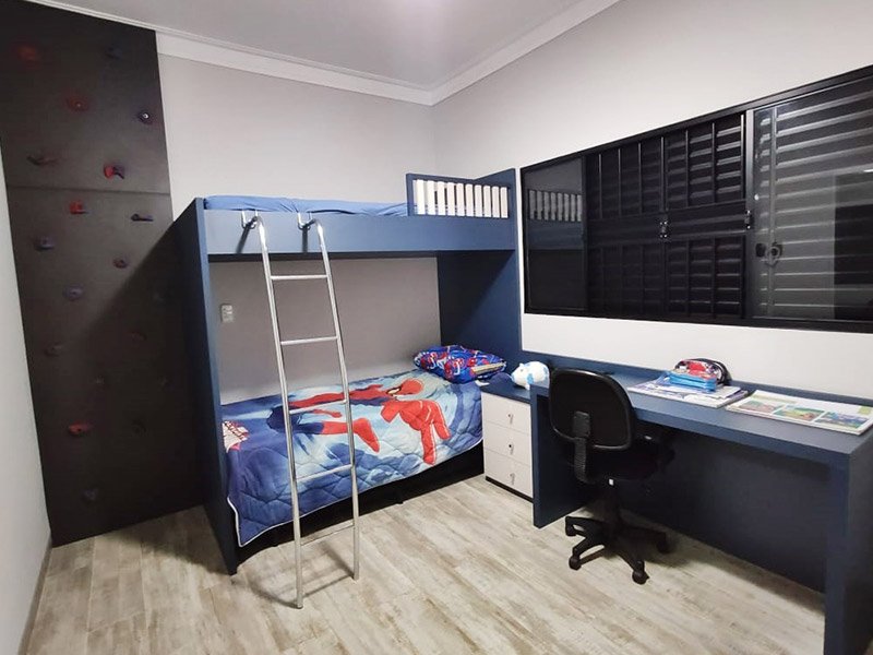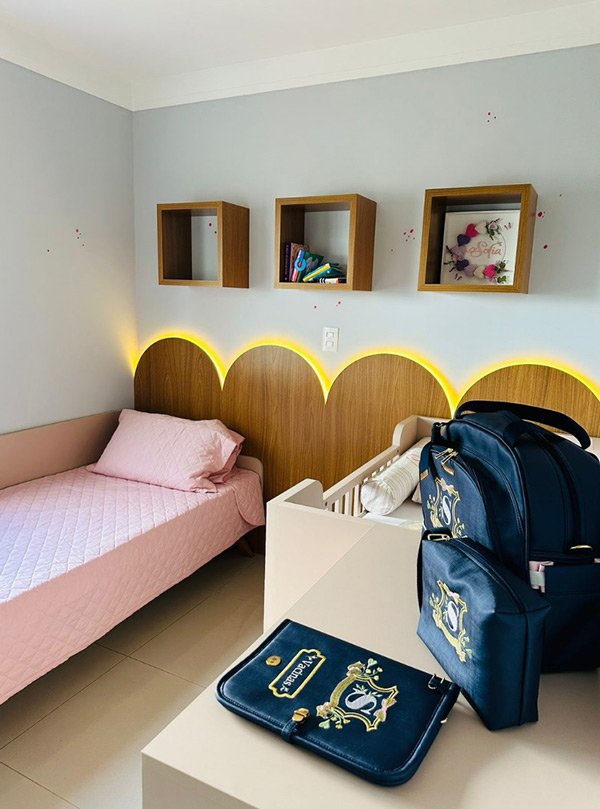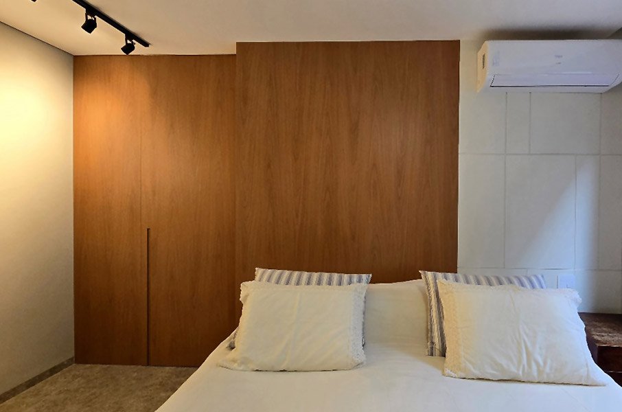 - Cabeceiras, painéis e criados-mudos integrados, que ampliam a unidade visual do ambiente;